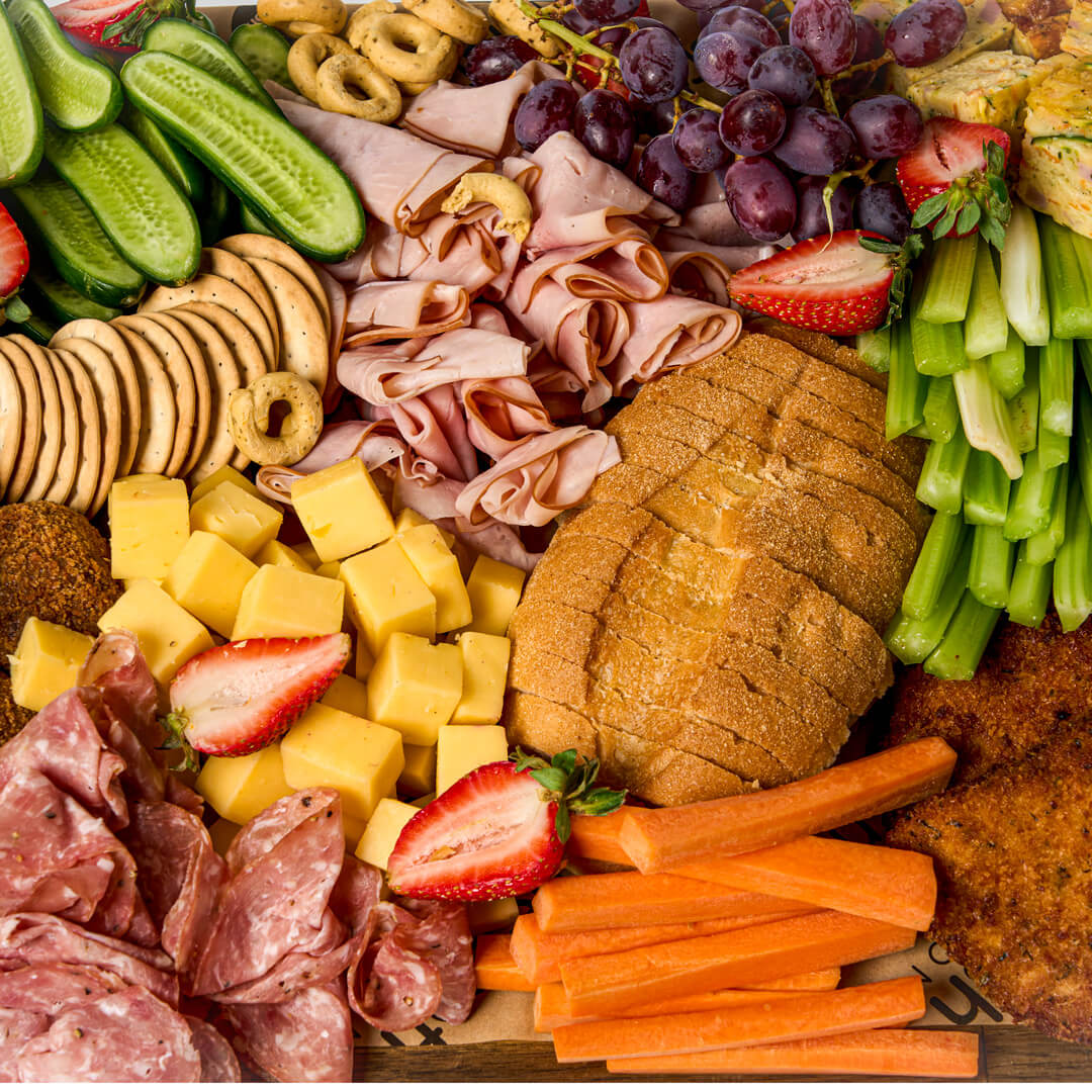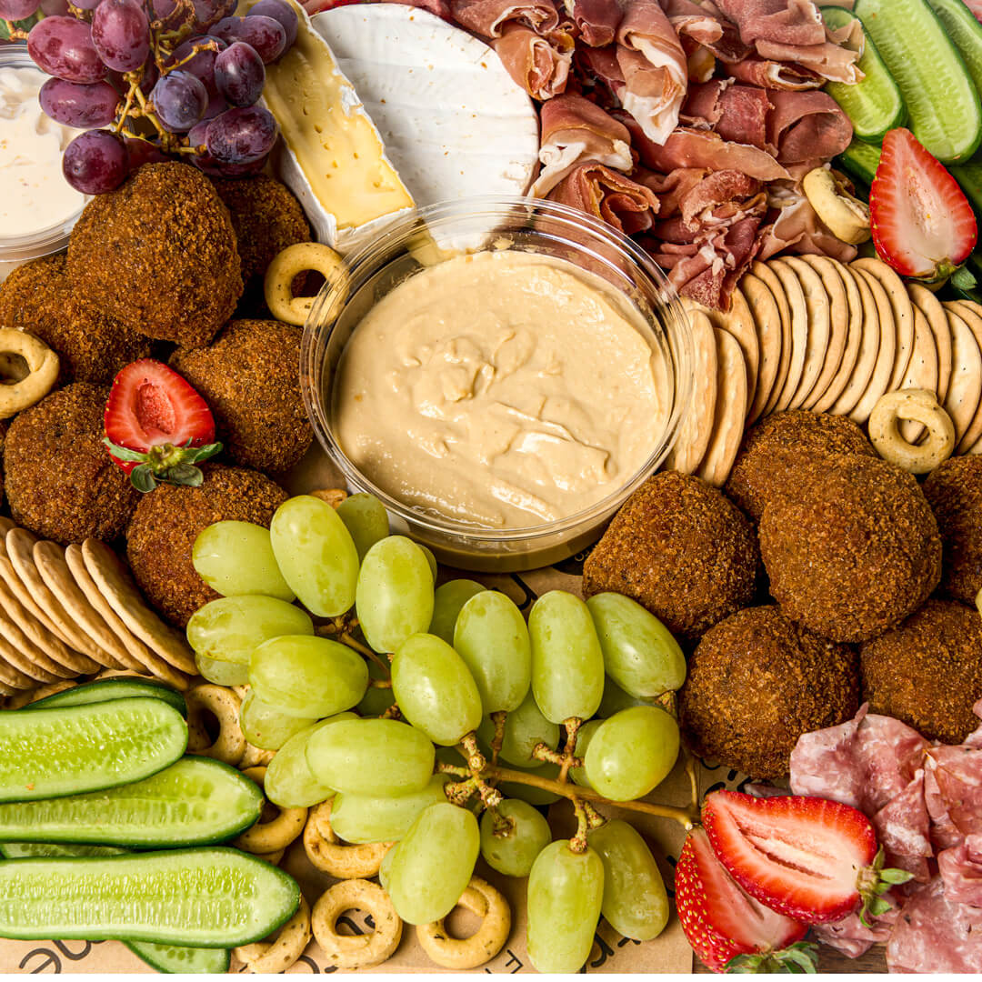 - Accompaniments Galore: Complement your spread with Olina Fig & Black Olive Crackers, Water Crackers, Veggie Sticks, Seasonal Fruit, and Almonds for a balanced and satisfying platter.